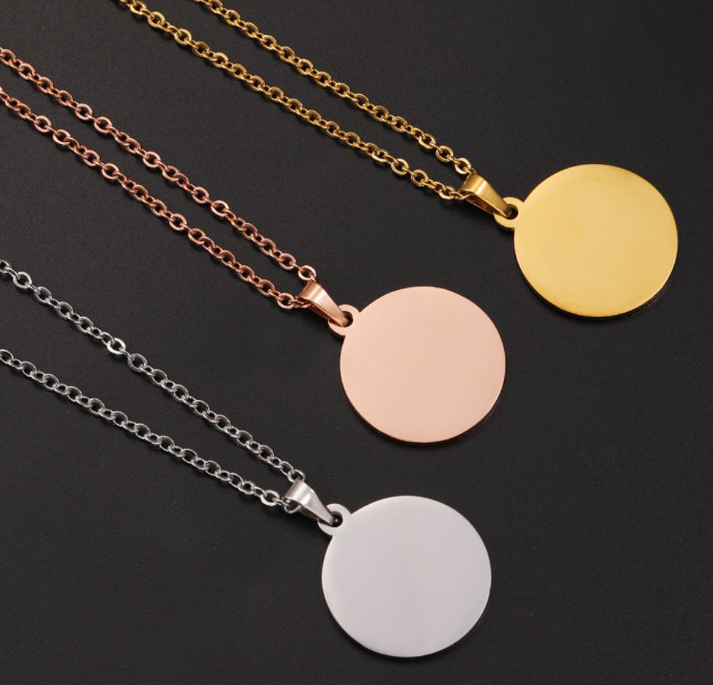 Our custom blank pendant necklace features a sleek, minimalist design, ideal for engraving a name, initials, a special date, picture or a meaningful symbol. Made from durable 304 stainless steel and finished in your choice of gold, rose gold, or silver tones—this piece is a modern classic for any occasion.